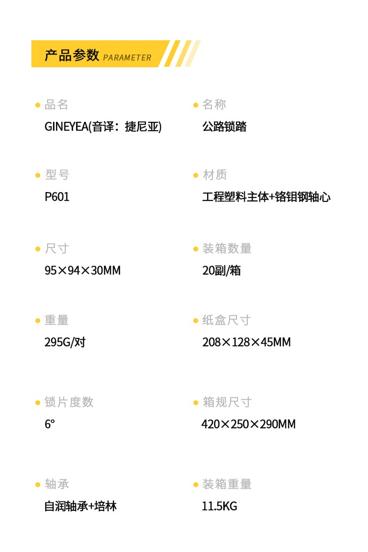 產(chǎn)品描述:請注意,本店標(biāo)價都是不包括稅點(diǎn),開票另加稅點(diǎn),詳細(xì)請咨詢客服?。?!品牌:GINEYEA(捷尼亞) 型號:P601 品號:13010014 品名:公路車鎖踏PRO(附鎖片6°)黑色執(zhí)行標(biāo)準(zhǔn):ISO4210 工藝:本體及扣片注塑成型材質(zhì):本體及扣片為工程塑料 軸心為鉻鉬鋼 顏色: 黑色/紅色/淺藍(lán)/橙色#公路車專業(yè)自鎖鎖踏,適用SPD-SL系統(tǒng),自帶鎖片體驗(yàn)不一樣的騎行速度、穩(wěn)定、省力,踏板流線型一體化設(shè)計(jì),高強(qiáng)度質(zhì)量輕的尼龍材料...