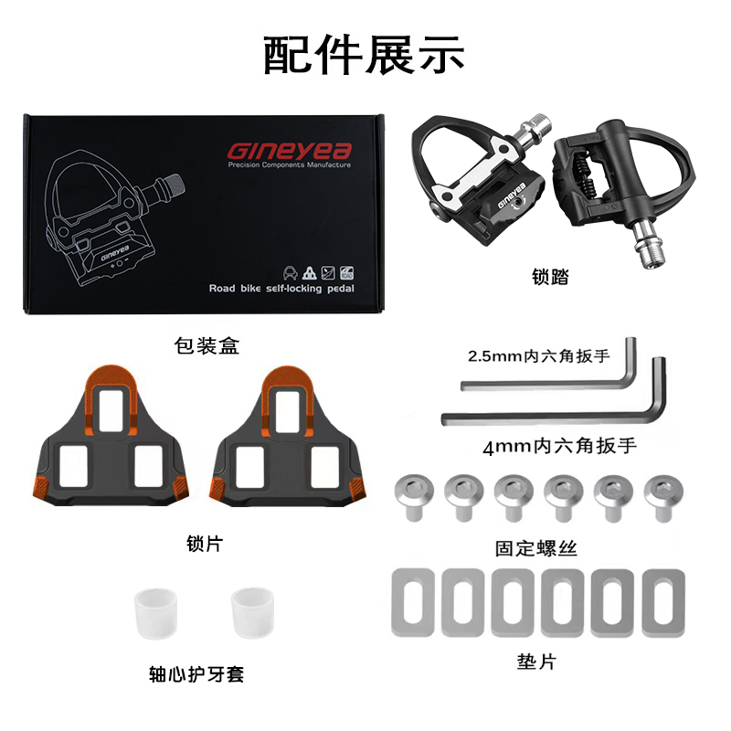 產品描述:品牌:GINEYEA(捷尼亞) 型號:P602 品號:13010426 品名:公路車鎖踏PRO(附鎖片6°)黑色執行標準:ISO4210 工藝:本體及扣片注塑成型材質:本體及扣片為工程塑料 軸心為鉻鉬鋼 顏色: 黑色/紅色/淺藍/橙色#公路車專業自鎖鎖踏,適用SPD-SL系統,自帶鎖片體驗不一樣的騎行速度、穩定、省力,踏板流線型一體化設計,高強度質量輕的尼龍材料加持,一對鎖踏僅重約278g,鎖片重量約88g,松緊度可調節的張力設置,靈...